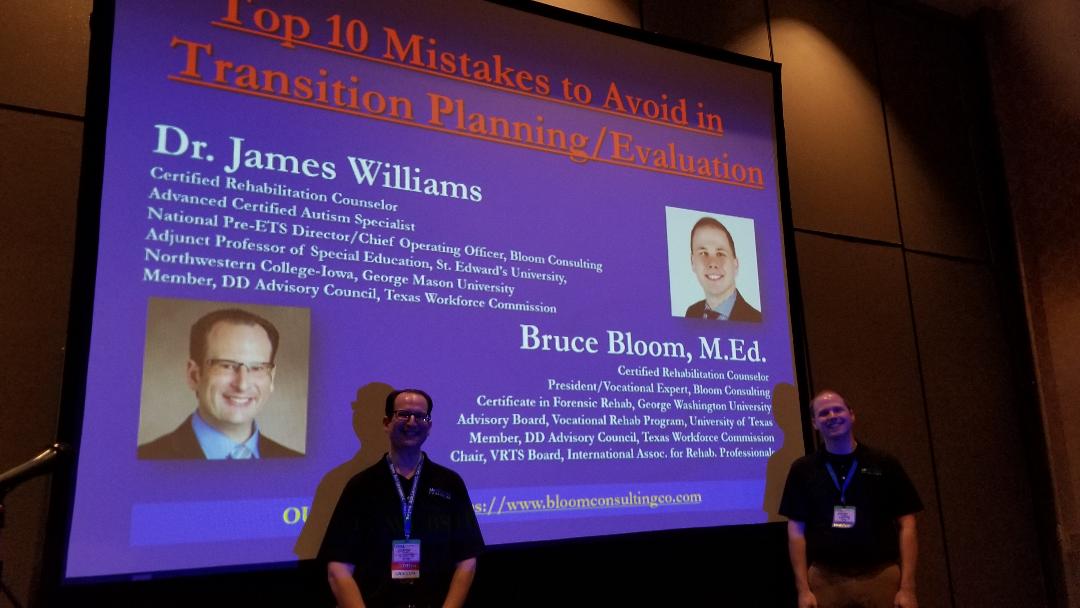 VRTS section members Bruce Bloom and James Williams presented at the Council of Parent Attorneys and Advocates Conference earlier in March. Their presentation, Top 10 Mistakes to Avoid in Transition Planning/Evaluation was presented to a full room. VRTS Chair, Bruce Bloom states that they received positive feedback from the attendees and he feels that those that advocate for special education students are starting to recognize the role that vocational rehabilitation professionals should have in transition planning.